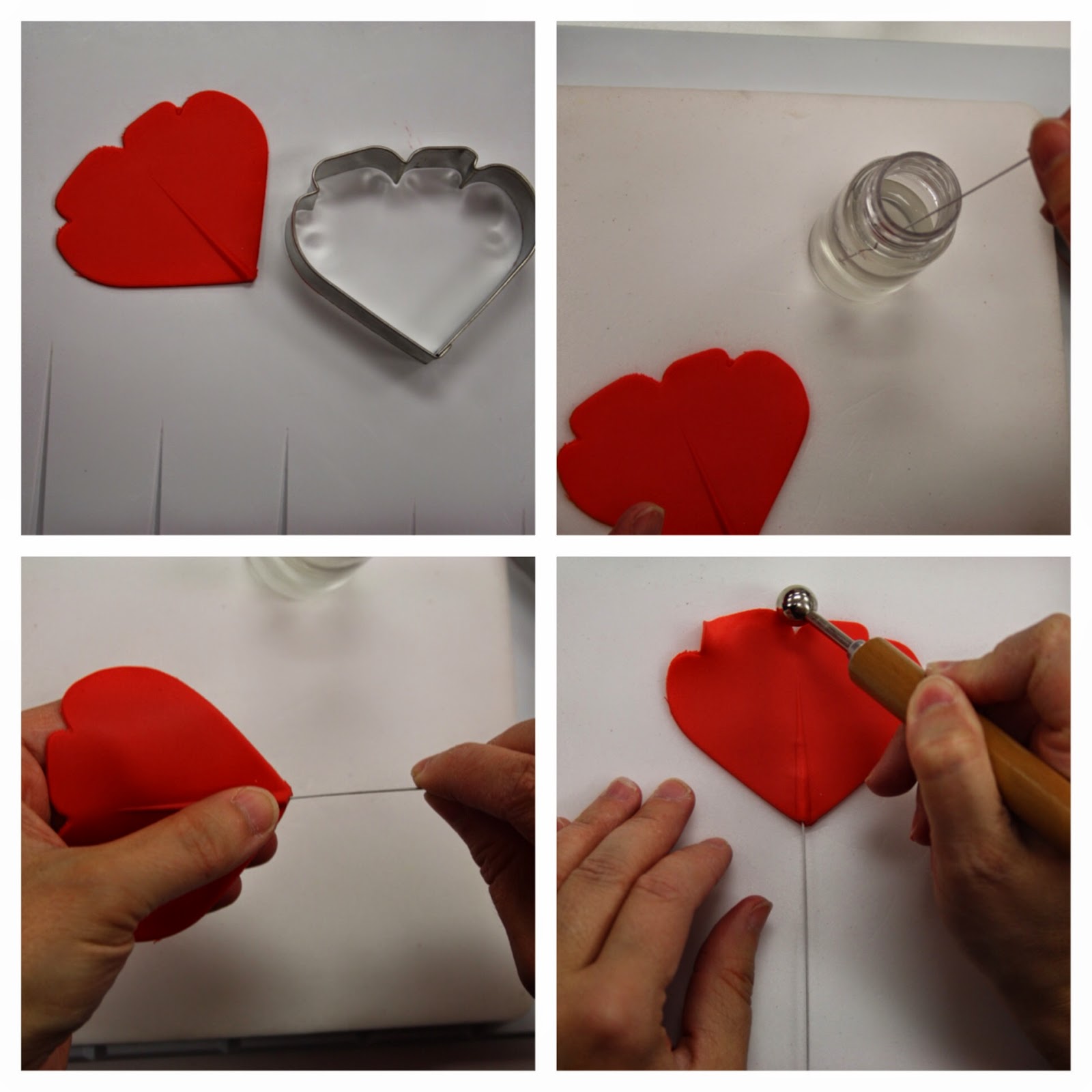 From rolled piece of gumpaste - cut out shapes as many as you require to complete your design. Practice different configurations on a flat surface or the counter prior to attaching to the cake.